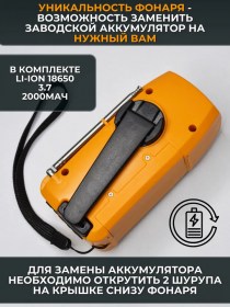 - Активное и интенсивное вращение рукоятки (более 130 вращений) продолжительностью в 1 минуту даёт фонарю заряд на ~15-20 минут работы фонаря; ~15-20 минут работы радио;