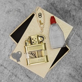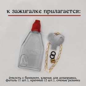 В комплекте с зажигалкой идет: пластмассовая фирменная бутылочка с бензином, специальный ключик для открытия емкости для дозаправки, фитиль (1 шт.), кремний (2 штуки). Данные предметы располагаются в коробке под зажигалкой.