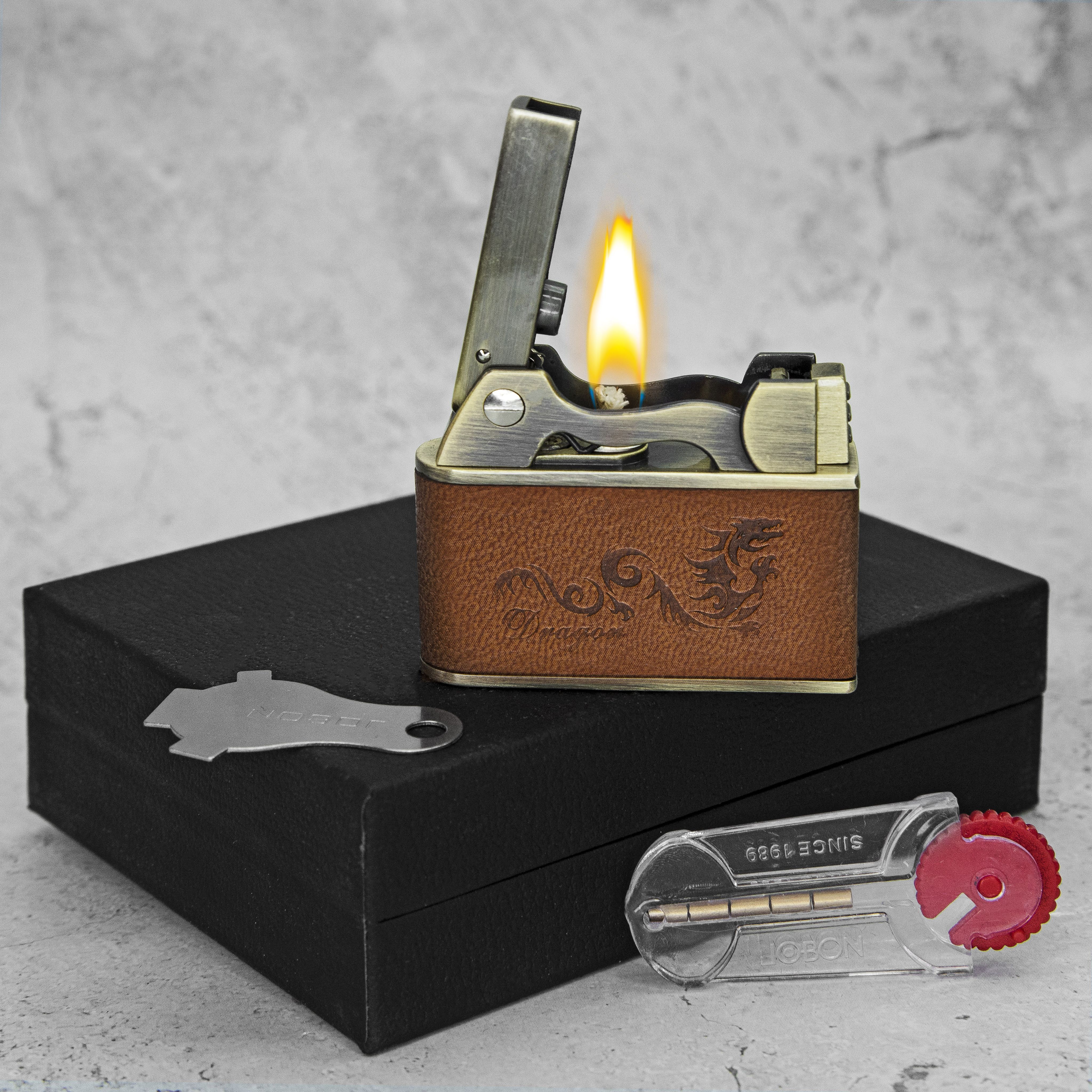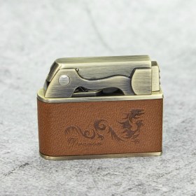 Бензиновая ветрозащитная зажигалка, автоматическая - металл и кожа / "Дракон" коричневый