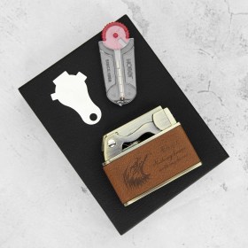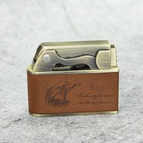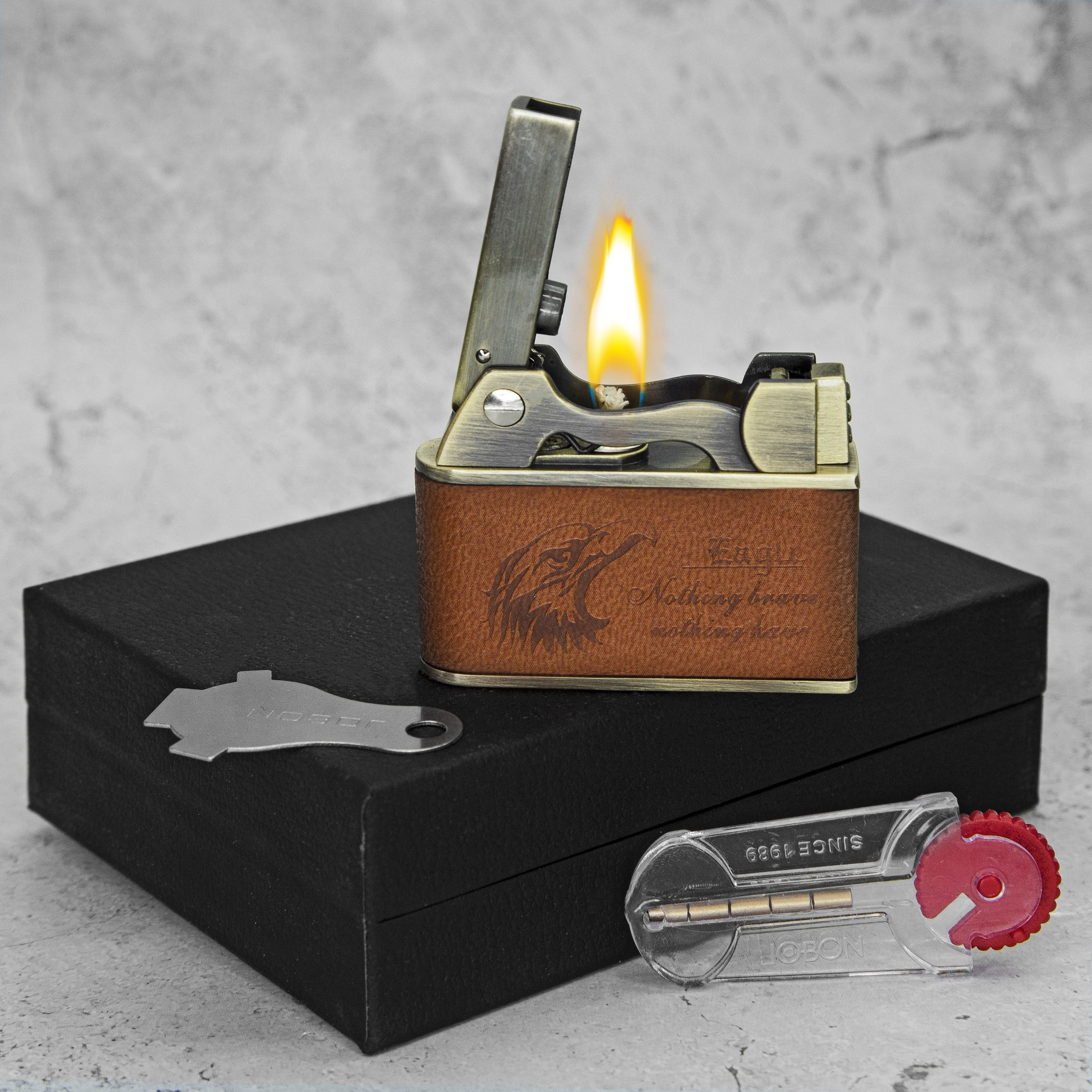 Бензиновая ветрозащитная зажигалка, автоматическая - металл и кожа / "Орел" коричневый