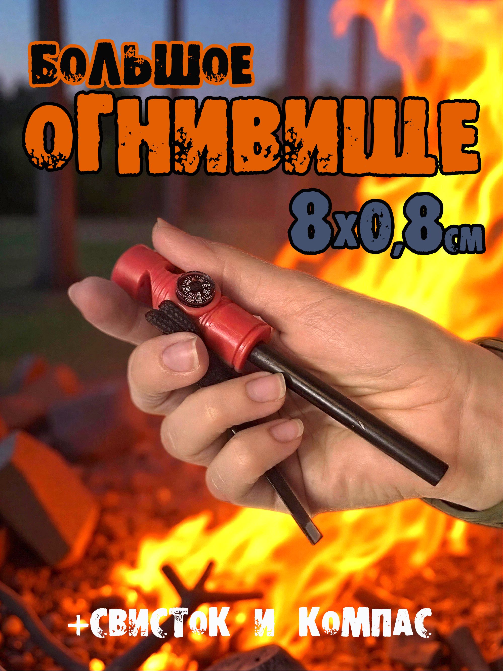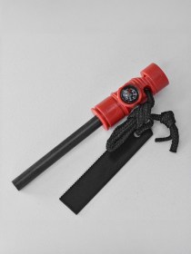 Во многих ситуациях огниво представляет собой чуть ли не единственную возможность развести огонь. Например, отсыревшие спички и пустая зажигалка известны каждому туристу. Разводить огонь руками – скорее удача в сочетании с жарким днём и обилием сухого топлива. Огниво же, искры которого обладают потрясающей температурой, позволит вам разжечь костёр в любую погоду. Изделие состоит из двух частей, скреплённых нейлоновым шнурком для удобства использования и хранения. На ручке огнива присутствует компас и свисток для подачи сигналов.