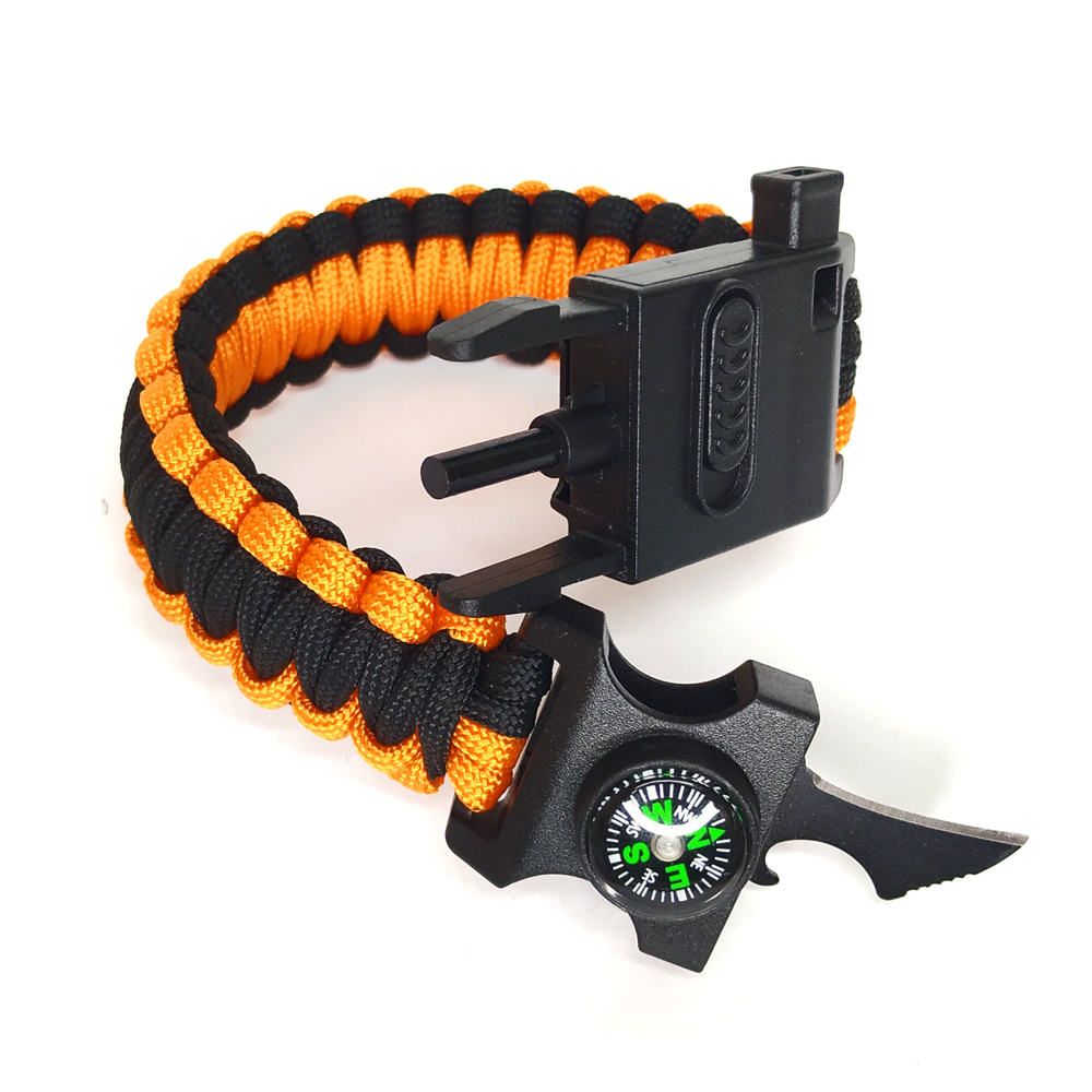 Браслет выживания с Ножом, огнивом, свистком компасом и фонарем черно-оранжевый