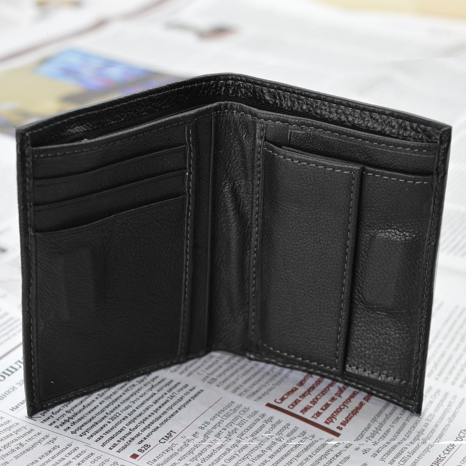 Множество отделений для банковских, скидочных и визитных карт.