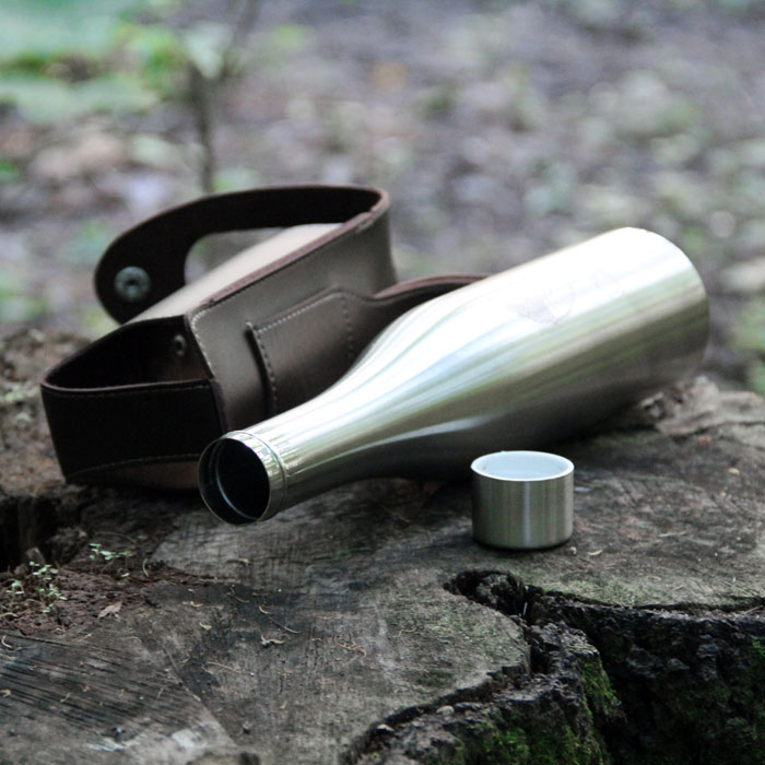 Нержавеющая сталь.Изящная форма в виде бутылки.Прочный и функциональный чехол из искусственной кожи с креплением на пояс.