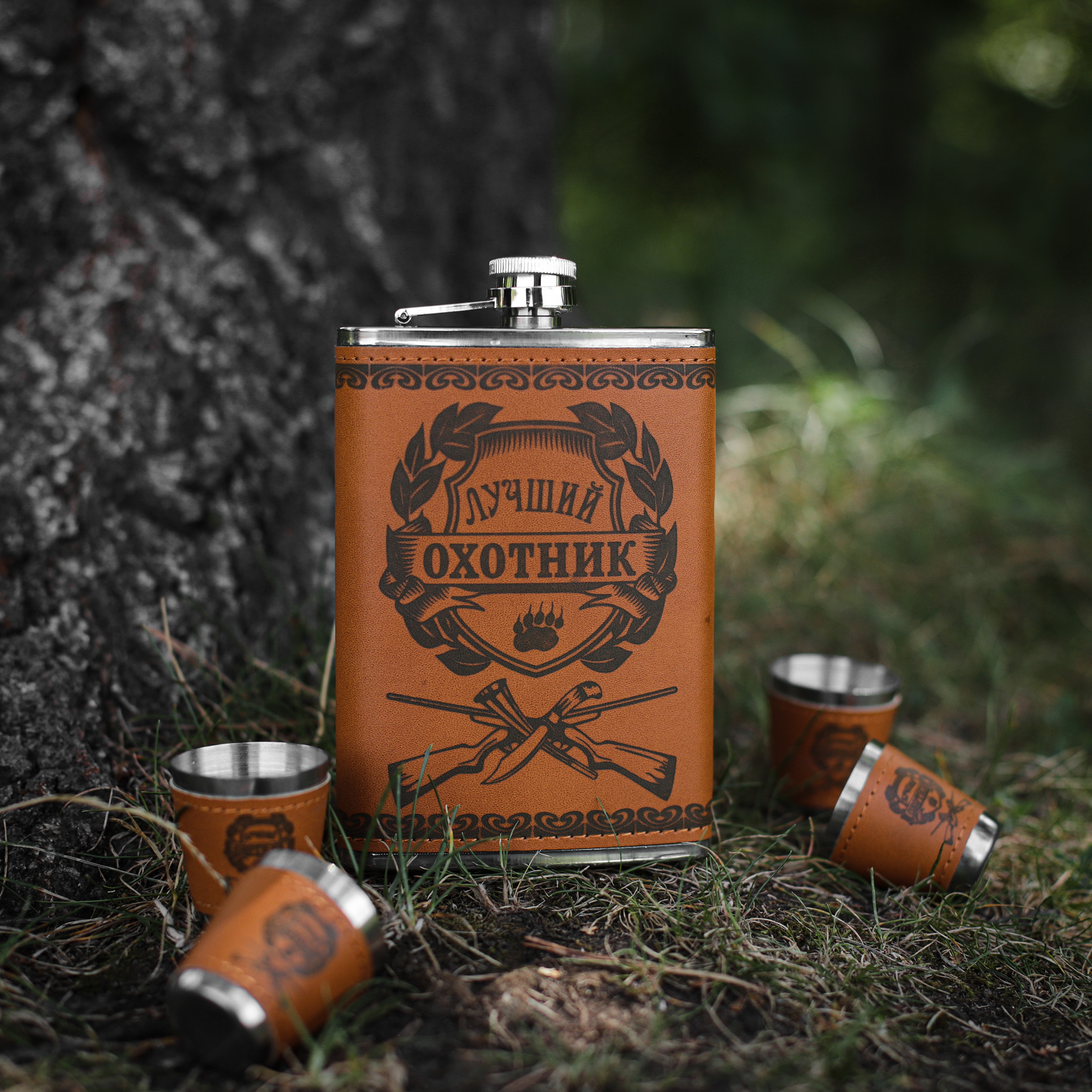 На лицевой стороне фляжки и 4-х стопок, нанесена символика "Лучший охотник". Набор красиво упакован в подарочную коробку.