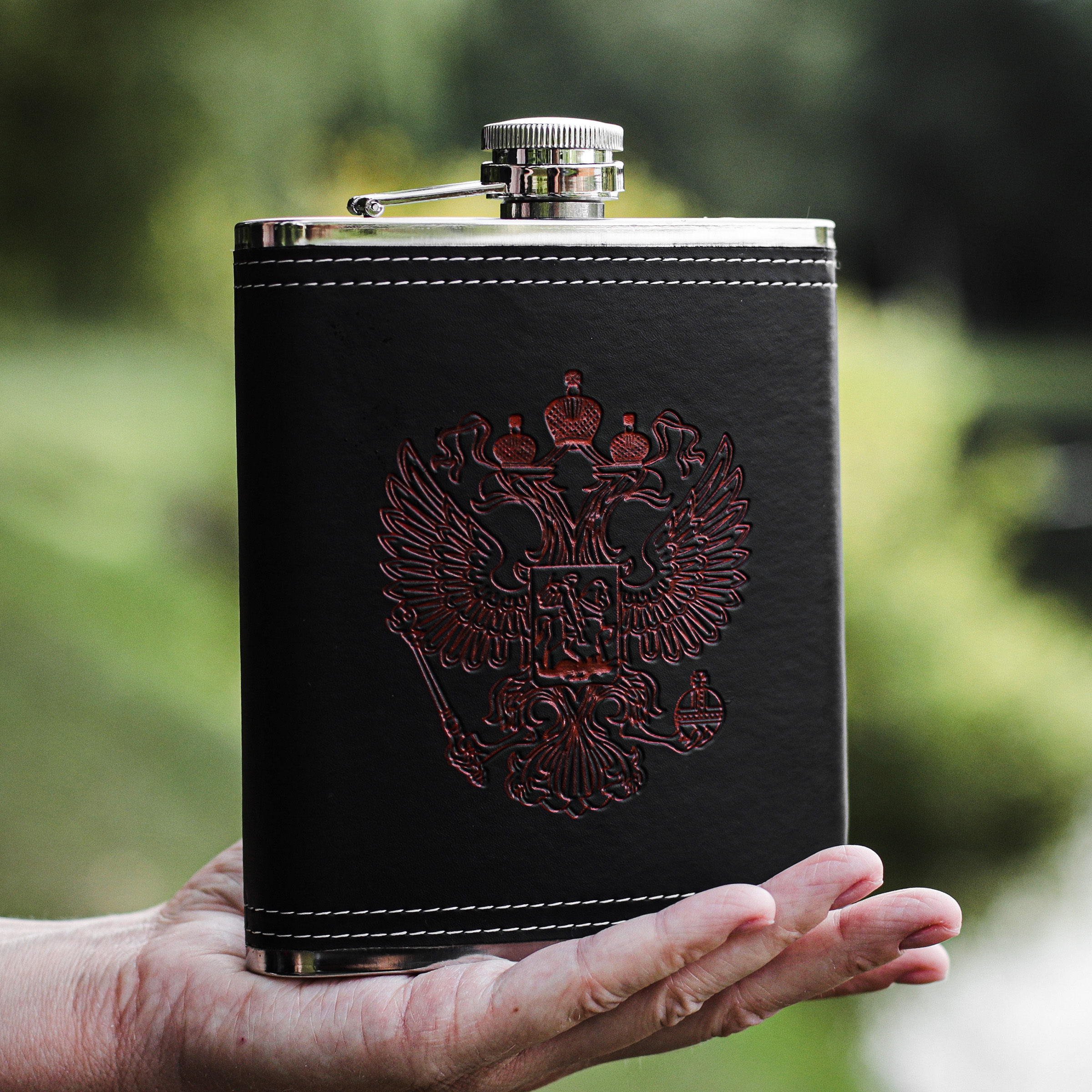 Оригинальная черная фляжка объемом 540 мл в чехле из заменителя кожи украшена гербом России, и отлично подойдет в качестве презента истинному патриоту своей державы! Фляга изготовлена из пищевой нержавеющей стали и подходит для всех видов напитков.