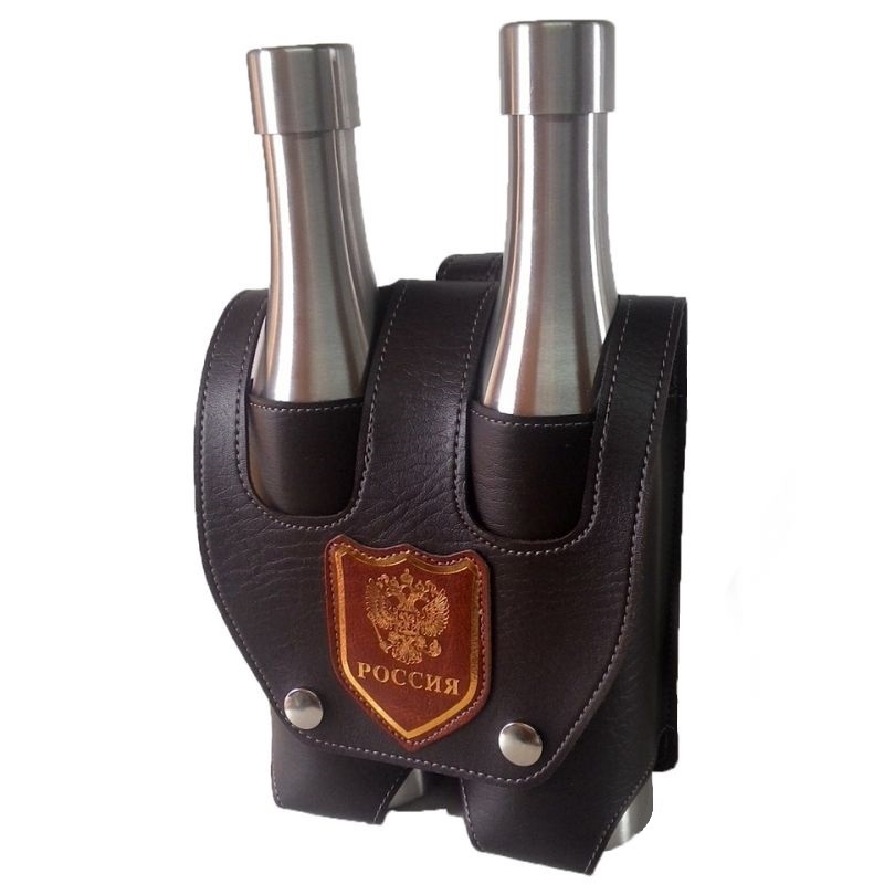 Таким комплектом можно порадовать любимого мужчину, коллегу по работе и друга. Элегантный кожаный чехол, в котором находятся 2 фляжки, оформлен эмблемой «Россия» и отлично будет держаться на поясе. Фляжки представлены в объеме 540 мл каждая, поэтому у туриста всегда с собой будет больше литра жидкости, что очень важно в походе.