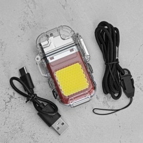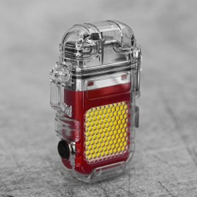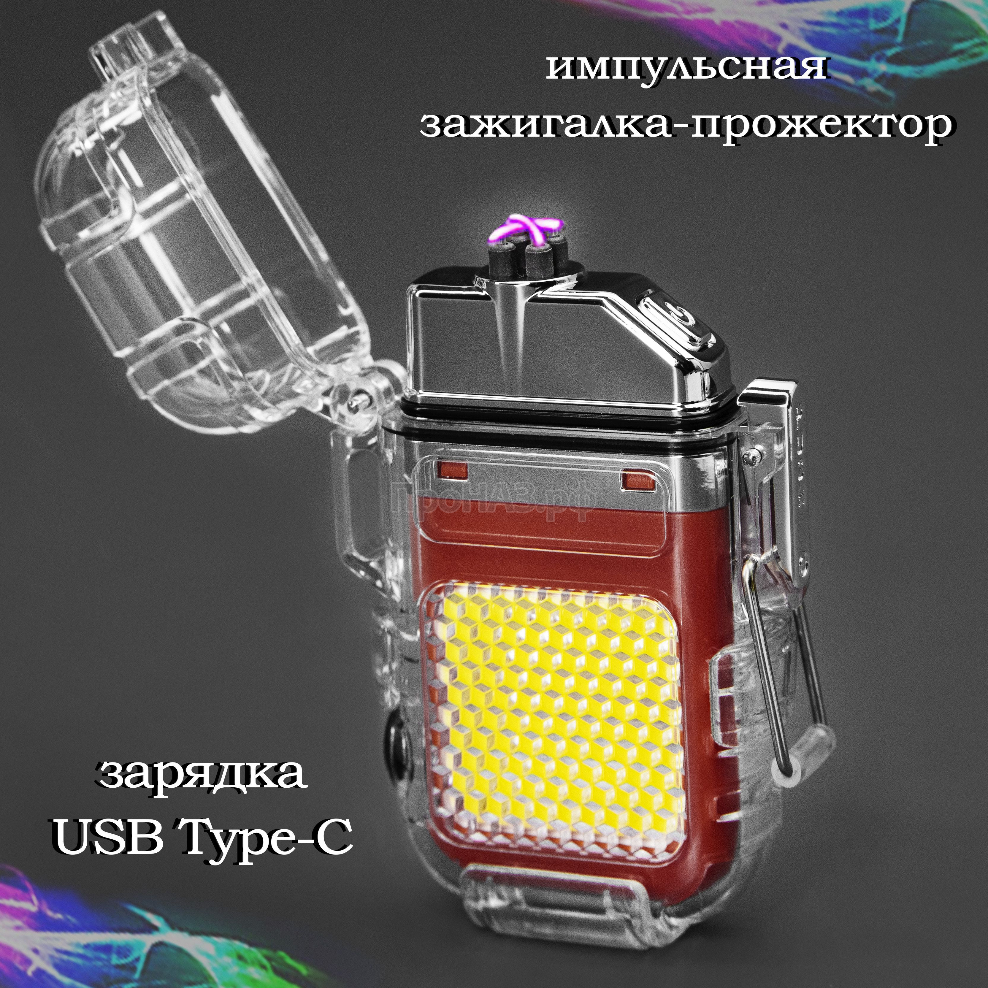 Импульсная зажигалка-прожектор COB-10W в пыле-водонепроницаемом боксе IPX7 / Сталь, зарядка Type-C, клипса на снаряжение или амуницию / Красная