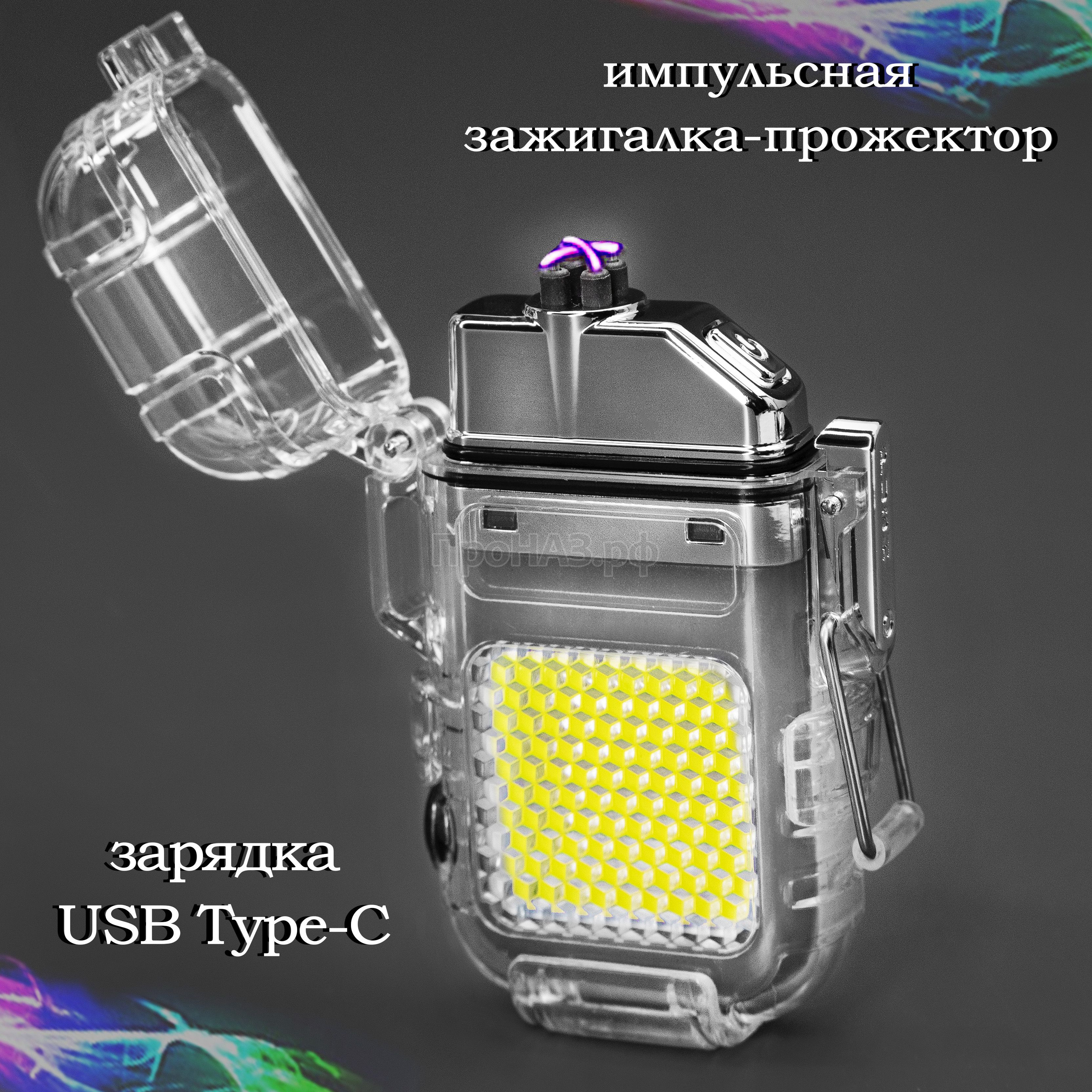 Импульсная зажигалка-прожектор COB-10W в пыле-водонепроницаемом боксе IPX7 / Сталь, зарядка Type-C, клипса на снаряжение или амуницию / Серебристая