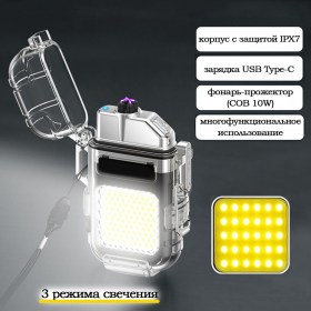 Данный девайс сочетает в себе: двойную дуговую зажигалку и яркий фонарь-прожектор (COB 10W), имеющий 3 режима свечения (мощный свет - умеренный свет - вспышка).