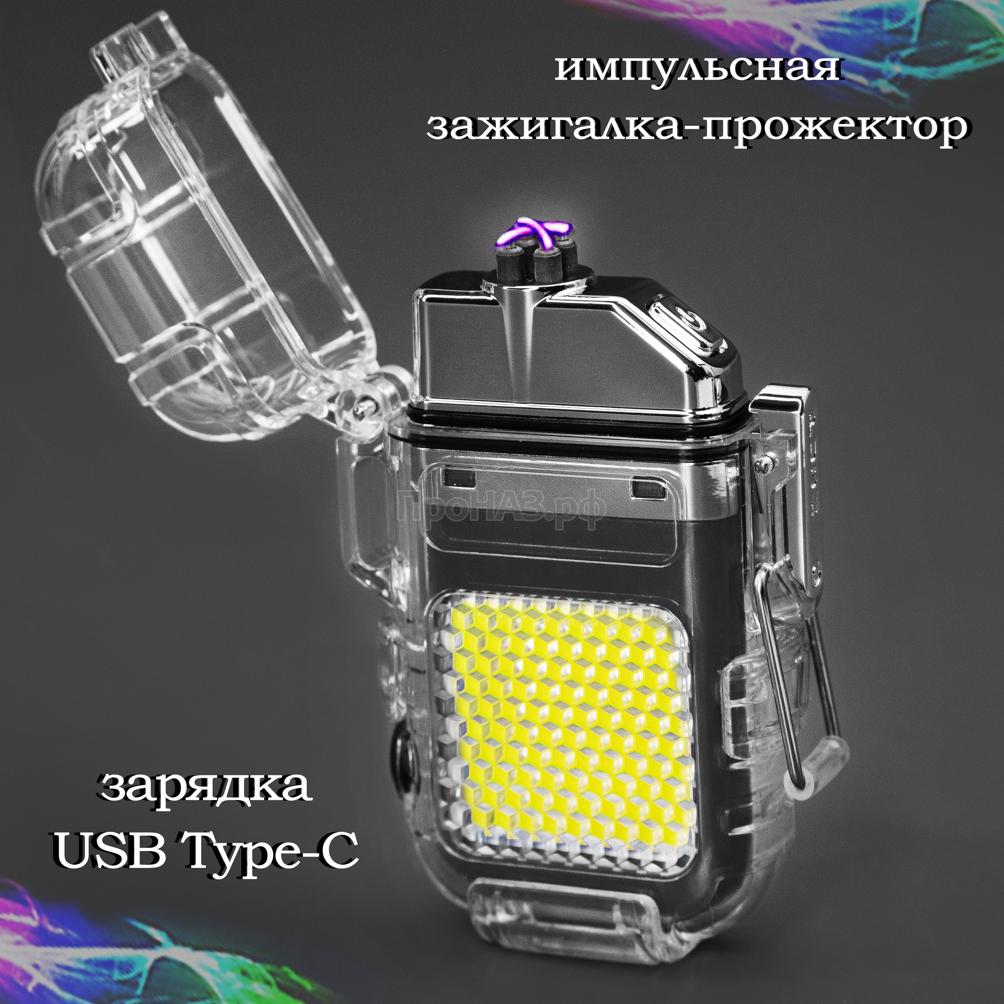 Импульсная зажигалка-прожектор COB-10W в пыле-водонепроницаемом боксе IPX7 / Сталь, зарядка Type-C, клипса на снаряжение или амуницию / Темно-серая