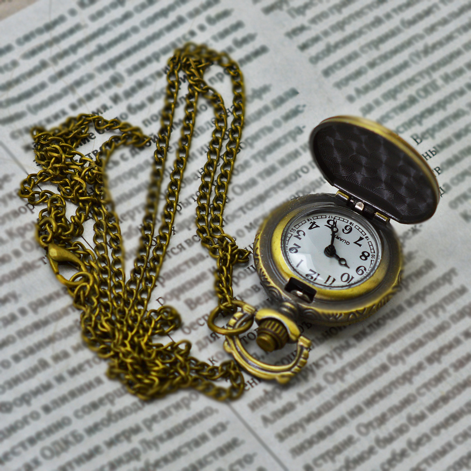 Оригинальные карманные часы на цепочке в металлическом корпусе .Задняя крышка богато украшена гравированным растительным орнаментом.Стильный акцент винтажного образа и оригинальная идея для подарка!