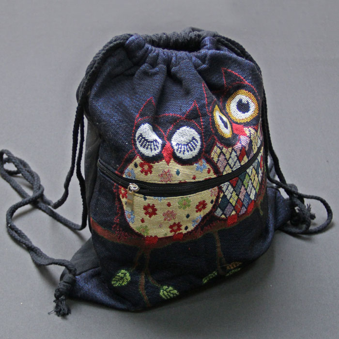Универсальный рюкзак для вещей, сделан из холстины, с вышитыми орнаментами, преобладают совы.