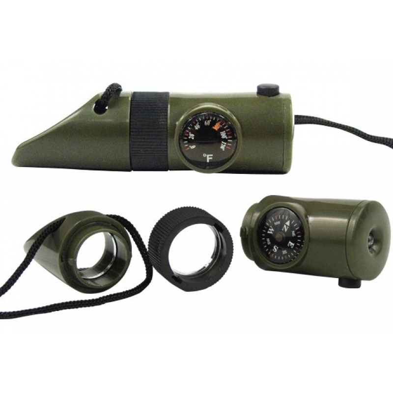 В конструкции компас-свистка предусмотрены шесть полезных элементов – включая термометр, свисток, компас, сигнальное зеркало, лупу, фонарь LED и сигнальное зеркало. С помощью корпуса становится гораздо проще комфортно ориентироваться на воде и суши. Компас-свисток выполнен со специальным шнурком, с удобством переноски и хранения.