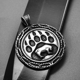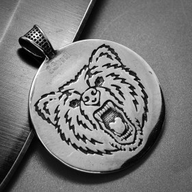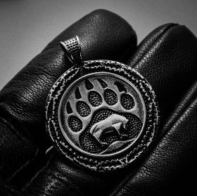 Форма кулона: круглый; на лицевой стороне изображена лапа медведя, с обратной стороны - рычащий медведь;