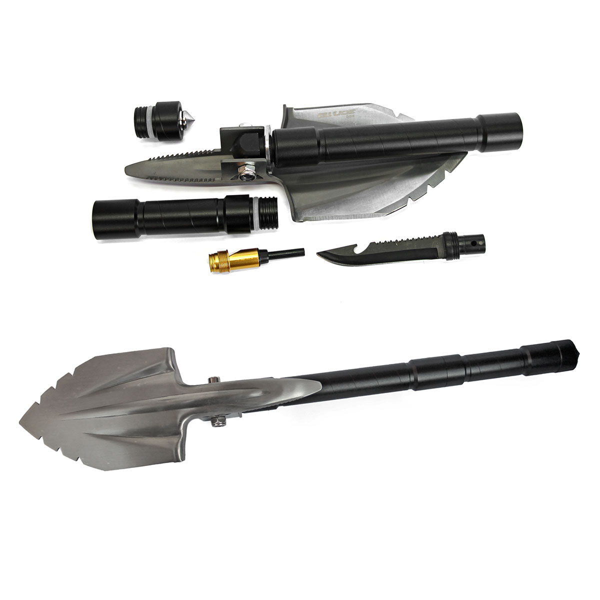 Лопата многофункциональная (топор, пила, кирка, нож) с огнивом благодаря небольшим размерам не займет много места в багажнике автомобиля, кофре квадроцикла, рюкзаке. В лопате есть место для организации набора выживания в герметичной полости внутри рукояти. Нержавеющая, толстая, прочная сталь.