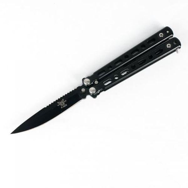 Небольшой карманный балисонг черного цвета. Подойдёт для девушек, подростков или людей с маленькой ладонью.Для облегчения конструкции в рукояти выполнены декоративные отверстия. Вес ножа составляет всего 65 гр. Для ношения на кармане имеется клипса.Нож отлично выполнит функцию для отработки трюков и флиппингу, а так же для повседневного использования.