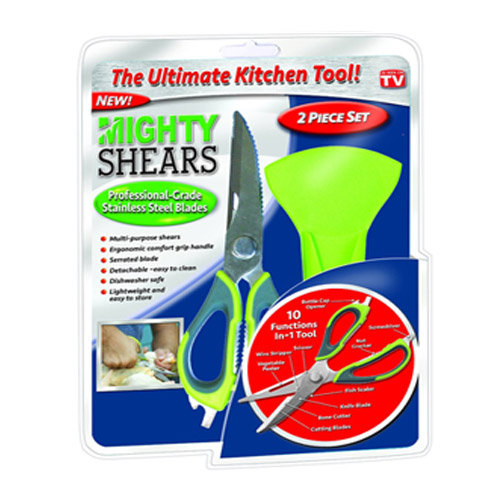 Конструкция Mighty Shears устроена в виде ножниц, которые объединяют в себе 10 функций. Используйте умные ножницы на кухне для очистки и нарезки зелени, овощей, мяса, птицы, рыбы, а также для колки орехов. С комфортной ручкой и острым лезвием ножа, Вы в кратчайший срок нарежете ингредиенты продуктов для блюд, не затрачивая при этом много сил и энергии. Пригодятся такие ножницы и в хозяйстве. Используйте устройство для зачистки проводов и встроенную отвертку.