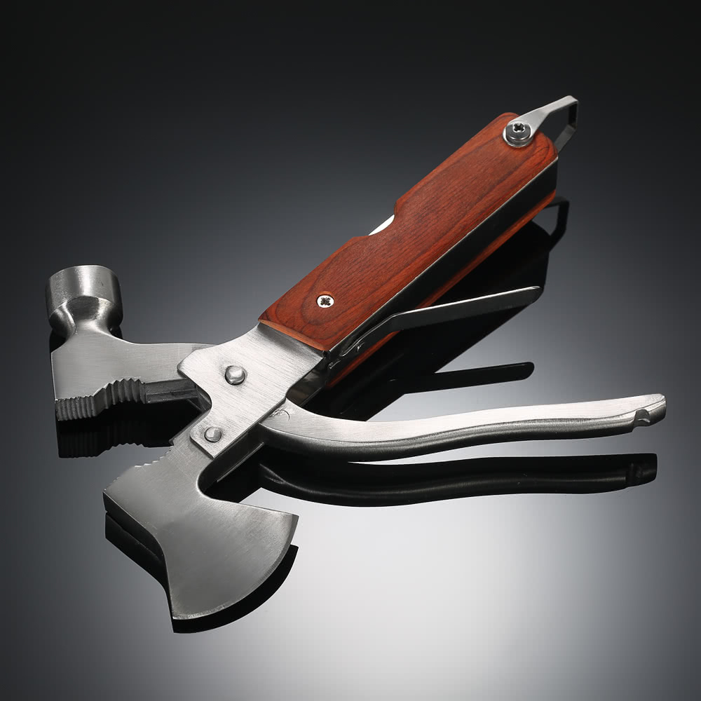 Большой мультитул просто незаменим для кэмпинга. Топорик поможет нарубить ветки, молоток -забить колья для костра и палатки.