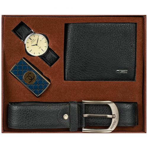 Комплект будет великолепным подарком для коллеги или близкого человека. Все аксессуары выполнены в едином классическом стиле: портмоне, наручные часы, ремень, зажигалка. Портмоне без застежки, в форме бифолда, раскрывается по принципу книжки, имеет одно отделение для купюр и 6 отделений для визитных и кредитных карт. Классические часы в металлическом серебристом корпусе с черным кожаным ремешком. Кожаный ремень с металлической серебристой пряжкой. Удобная и прочная зажигалка в металлическом корпусе.
