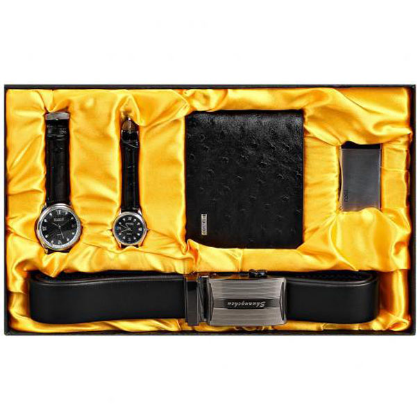 Оригинальный мужской подарочный набор, состоящий из 5-ти предметов: портмоне, пара наручных часов, ремень, нож-раскладушка. Кошелек выполнен в форме бифолда, раскрывается по принципу книжки. Портмоне без застежки, имеет несколько отделений для купюр, для визитных и кредитных карт. Классические мужские часы двух размеров в металлическом серебристом корпусе с черным кожаным ремешком. Кожаный ремень с металлической серебристой пряжкой. Стильная зажигалка в металлическом корпусе.