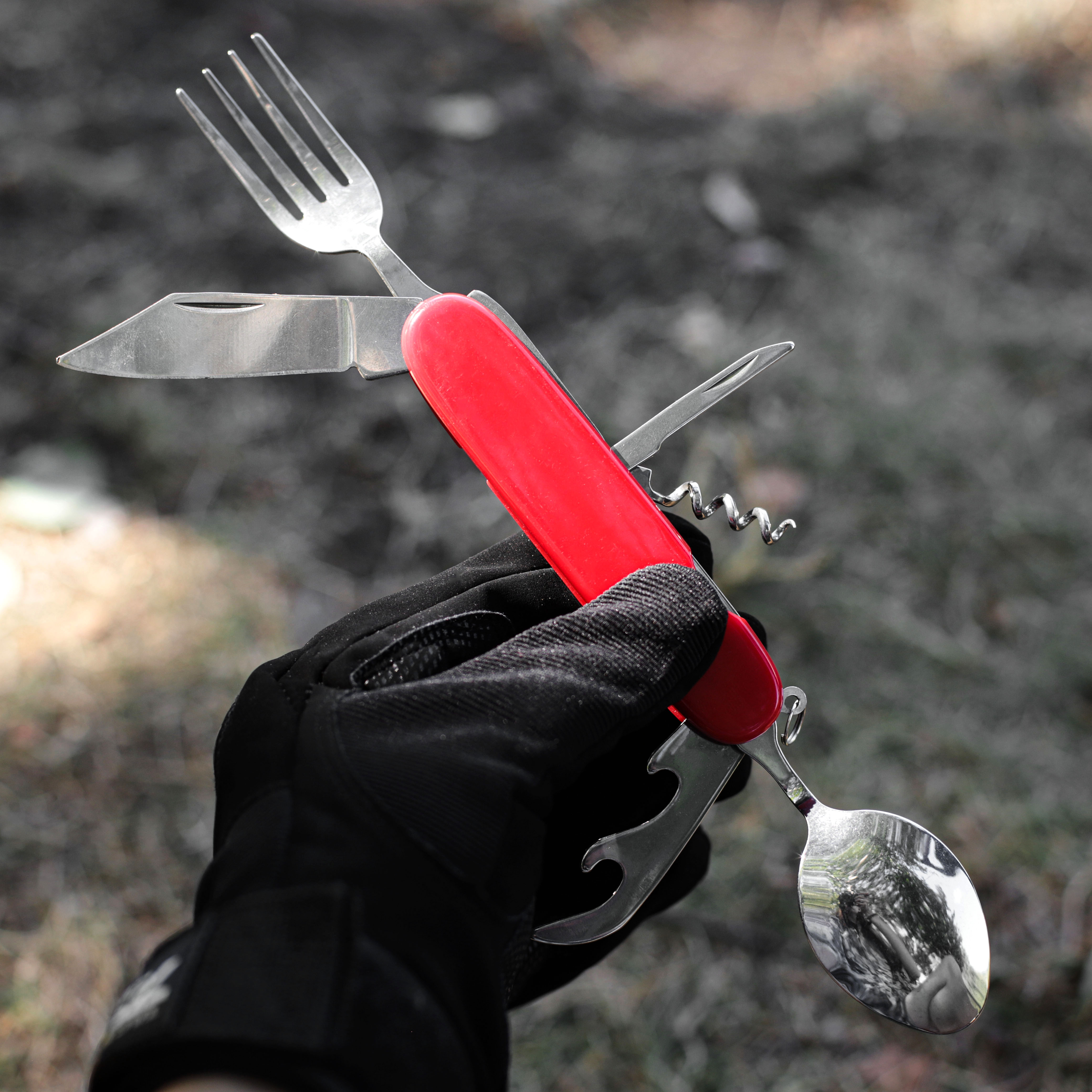 Набор складных столовых приборов мультитул 5 в 1, из качественного металла внешняя сторона покрыта прочным пластиком, что придает столовым приборам стильный вид и удобство в использовании. Чехол.