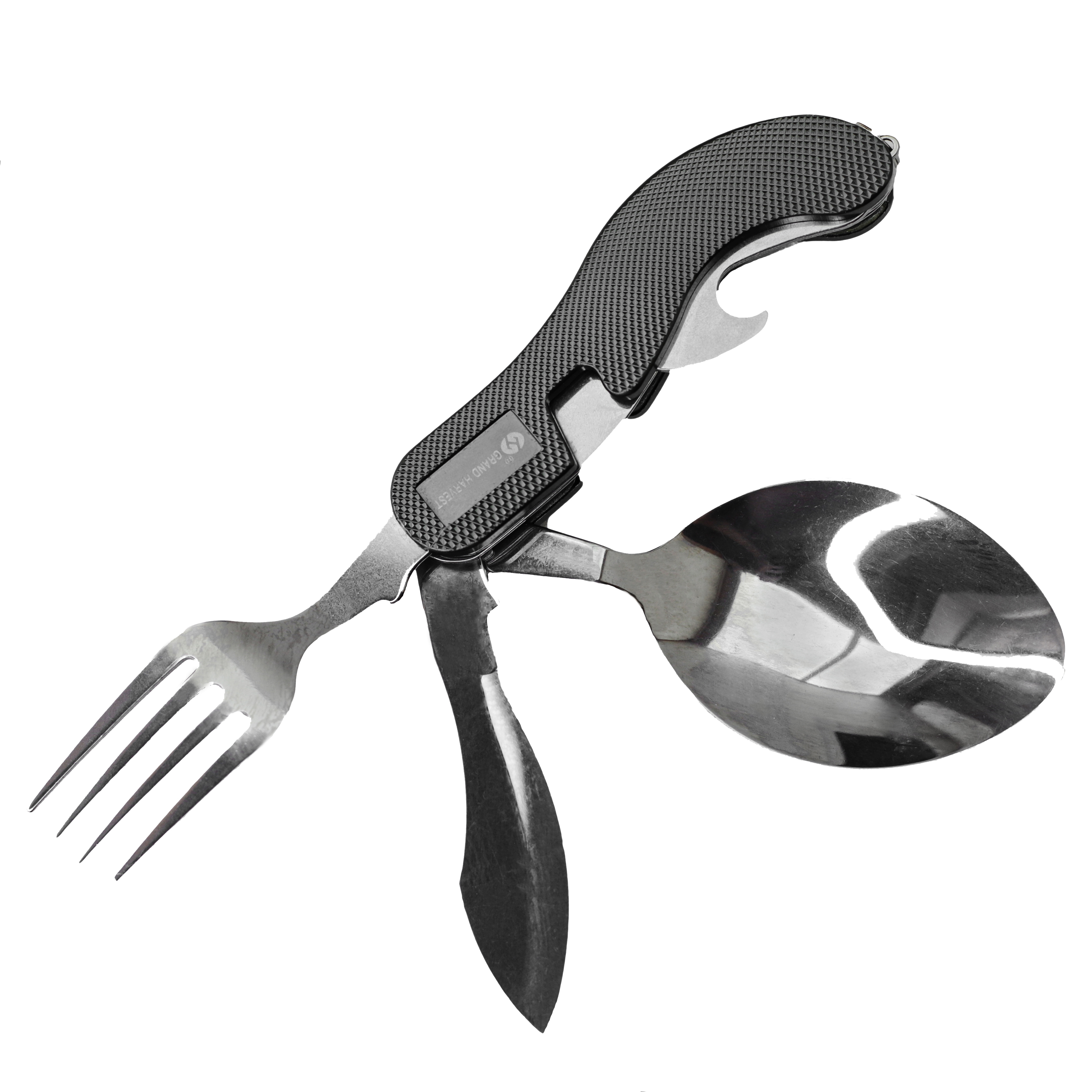 Комплектуется: ножом, ложкой, вилкой, открывалкой. Для удобства использования, разделяется на 2 части.