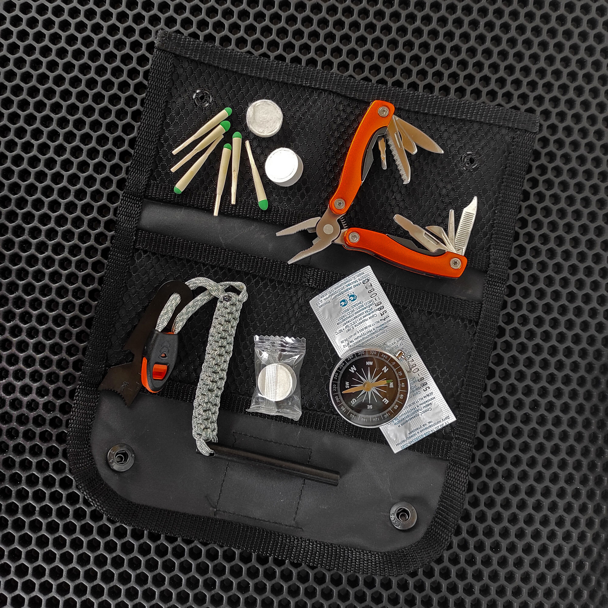 Скрутка-органайзер с 4-мя кармашками из сетки, для хранения и транспортировки необходимых предметов используемых в походах и в наборах выживания.