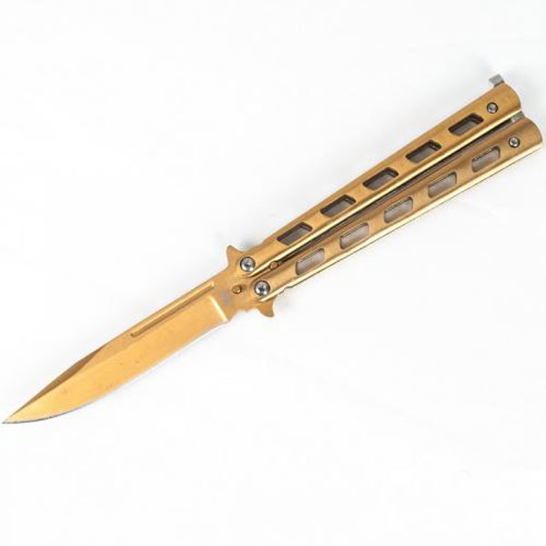 Среди ножей-бабочек имеет средний вес. Сделан из нержавеющей стали в золотистой расцветке. По тактильным ощущениям балисонг удобно лежит в руке. Рукоятка имеет декоративные узоры, снижающие вес ножа. На нижней части клинка есть боковые выступы, которые служат в качестве упора для пальцев.
