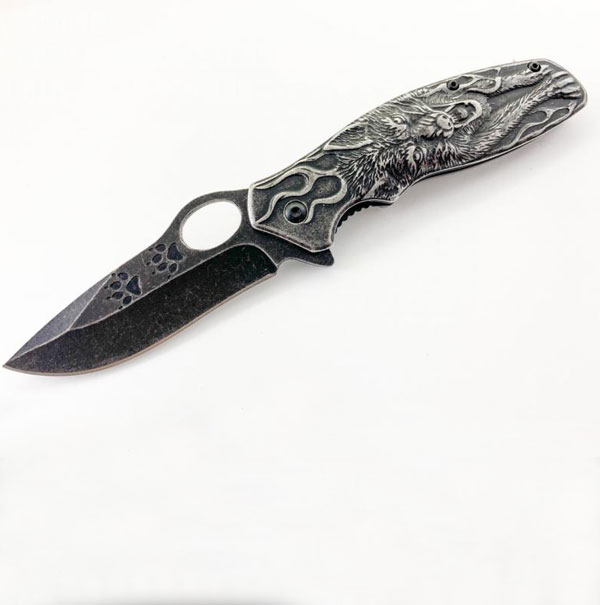 Стальной складной нож WEREWOLF. Дизайн выполнен в стиле кованной стали. Матовый цвет лезвия, удобная рукоять для кисти среднего размера. Ограничитель хвата - чуть больше половины указательного пальца. Заточка изначально отличная - режет лист формата А4 на весу. Идеальный подарок охотникам.
