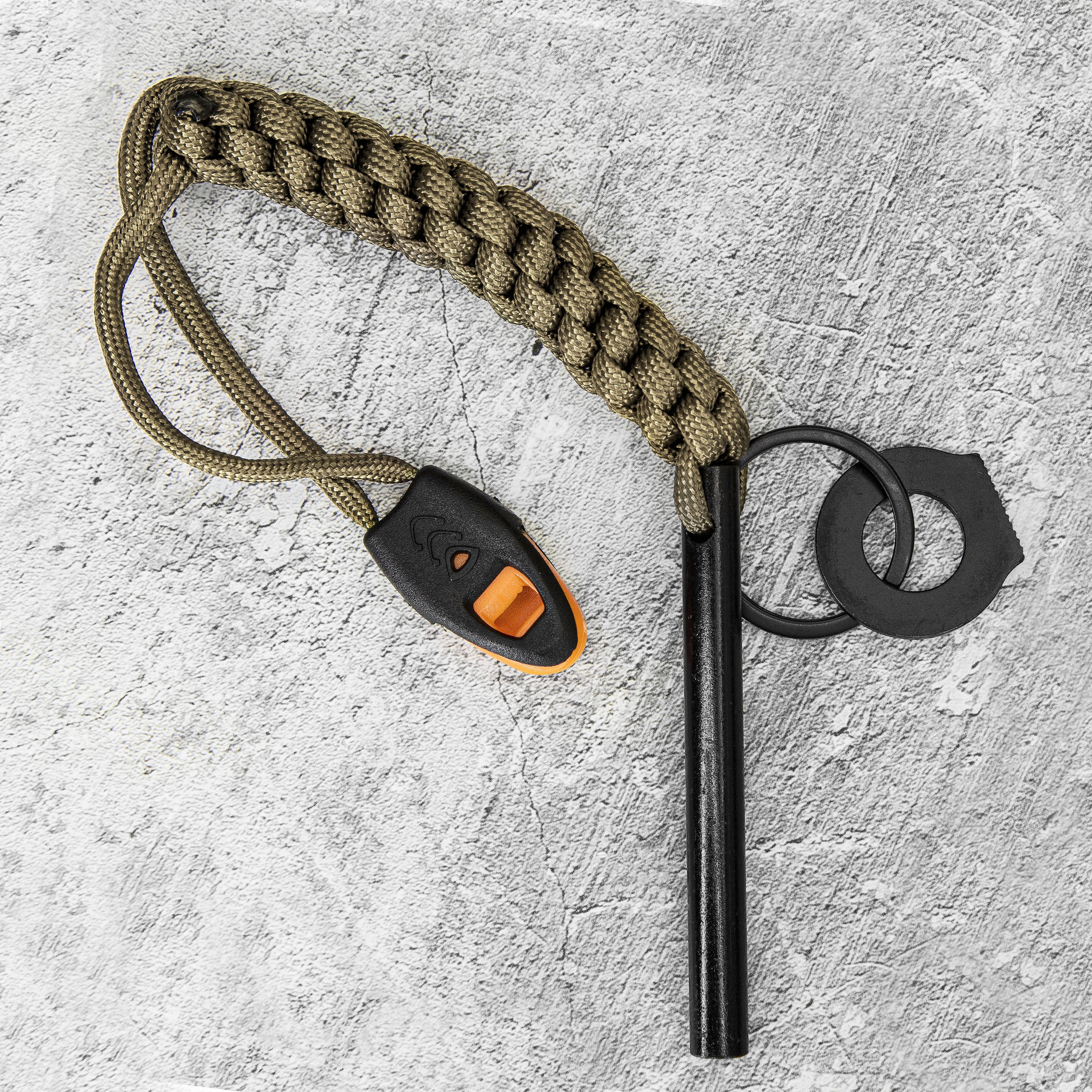 Стержень огнива выполнен из ферроцерия (сплав не менее чем из 7 редкоземельных металлов), в паре с кресалом из нержавеющей стали, обеспечивающее высечение искр, паракордом и свистком.