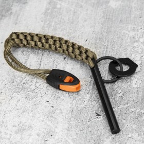 Стержень огнива выполнен из кремния, в паре с кресалом из нержавеющей стали, обеспечивающее лёгкое высечение искр. В комплекте так же идёт паракорд и свисток.