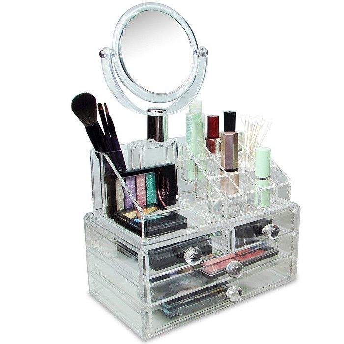 Невероятно вместительный и удобный акриловый органайзер для хранения косметики Cosmetic Organizer. Благодаря прозрачным стенкам, поиск необходимой вещи проходит быстро. Вмещает в себя все необходимые дамские вещи. Данная модель оснащена зеркалом, а это значит что для того чтобы нанести макияж Вам нужет только органайзер для хранения косметики с зеркалом Cosmetic Organizer.