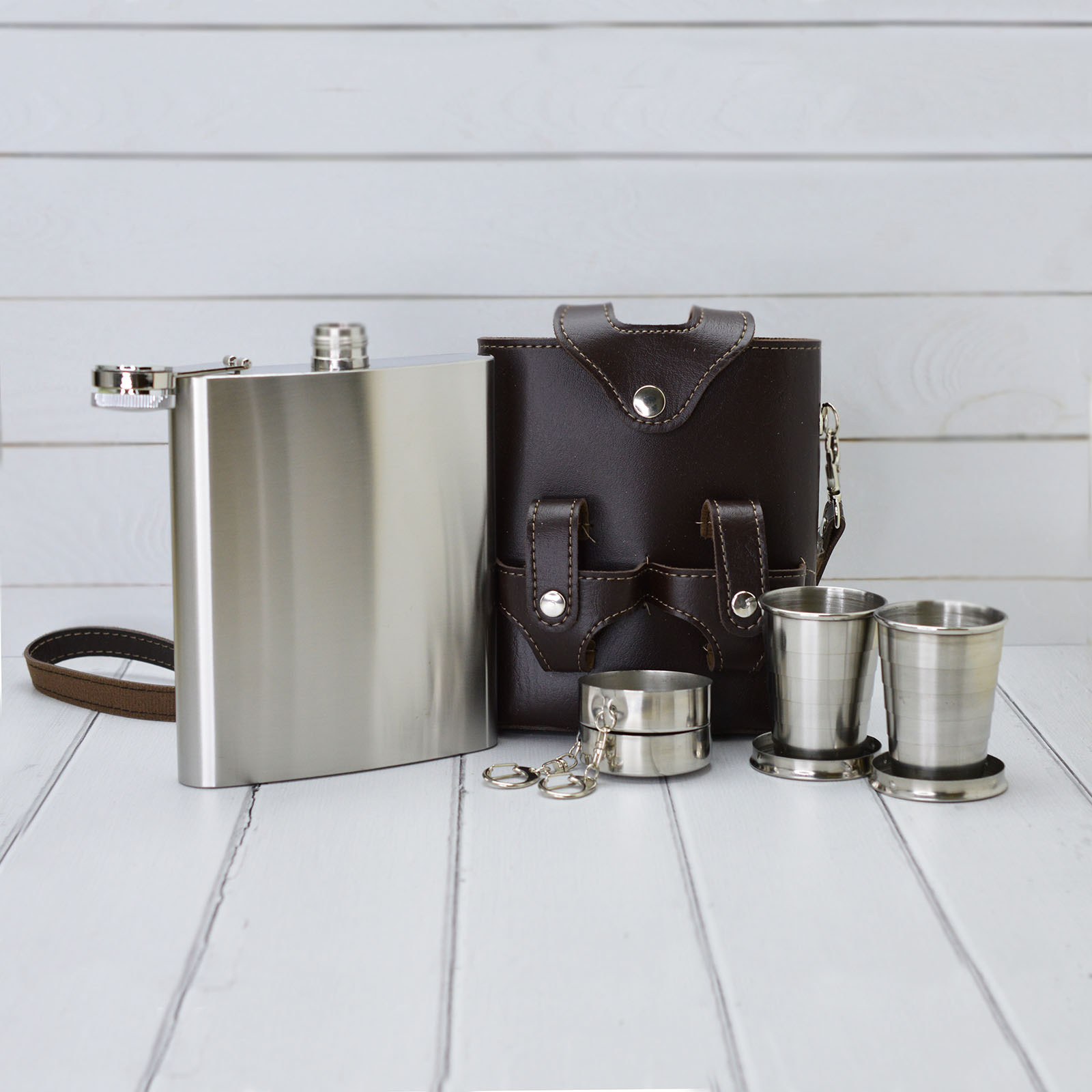 Подарочный набор фляжка 500 мл и 2 складных стакана с крышкой (темно-коричневый)