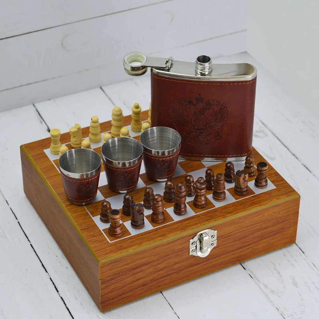 Походные и подарочные шахматы, фляга, 3 стакана в чемодане. Фигурки дерево, размер поля 20х20 см.