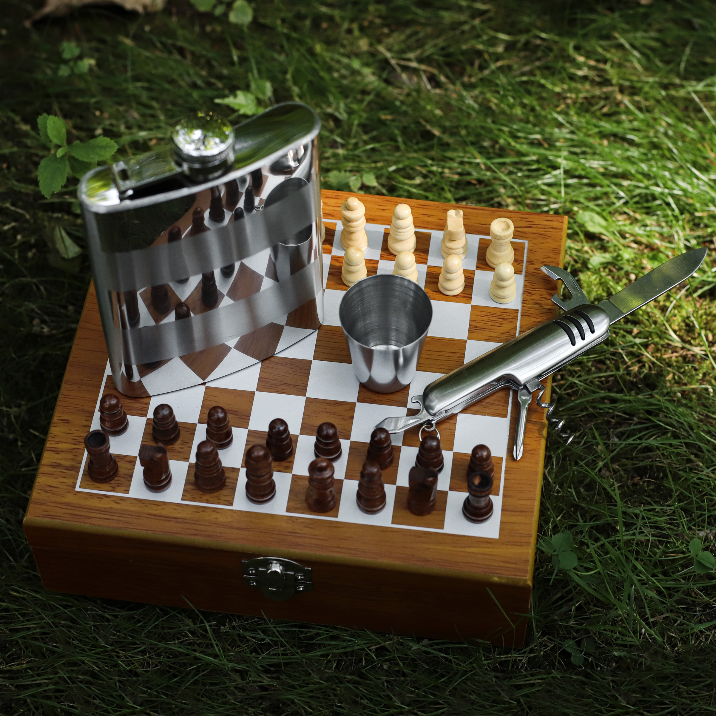 Походные и подарочные шахматы, фляга, стаканчик и мультитул в чемодане. Фигурки дерево, размер поля 20х20 см.