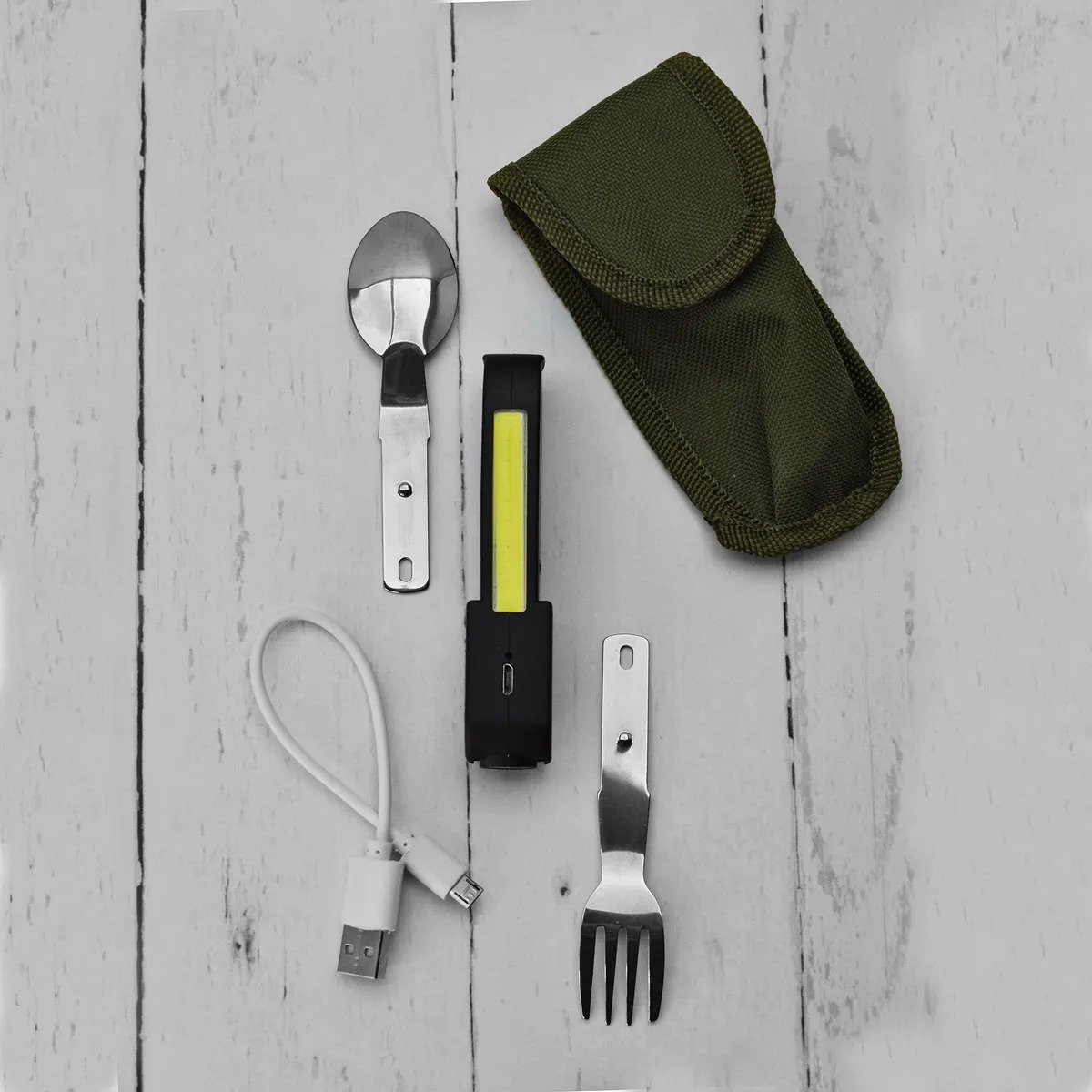 Незаменимый походный набор включающий в себя: вилка ложка беспламенная спиральная USB зажигалка лазер боковой фонарик Набор выполнен из высококачественной нержавеющей стали, упакованный в специальный чехол