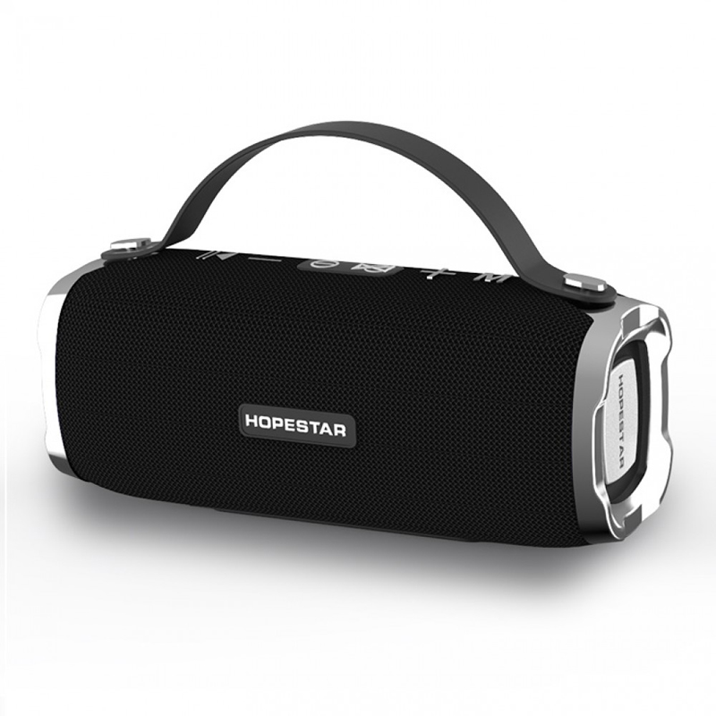 Hopestar H24 имеет форму “бочки”, корпус обтянут жесткой тканью, по бокам металлические накладки, кнопки управления сделаны из металла, сверху акустики прикреплён резиновый ремень, разъемы в задней части закрыты резиновой заглушкой. В колонке 2 динамика размером 57 мм и по бокам 2 пассивных излучателя. В колонке USB разъём используется для воспроизведения с флешек, microUSB – для зарядки колонки и как вход для FM антенны, антенной служит комплектный USB-кабель с интерфейсом microUSB.