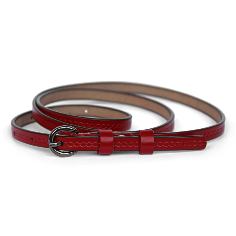 Женский ремень из натуральной кожи. Прекрасно держит форму и не теряет внешний вид. Частично прошит черной вощеной нитью. Пряжка никелевая глянцевая.