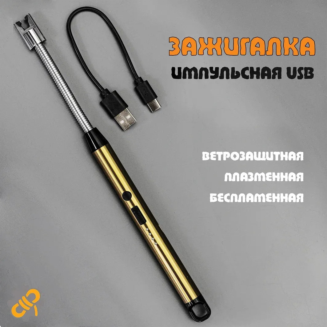 Зажигалка кухонная, импульсная USB дуговая , ветрозащитная, плазменная, беспламенная, для газовой плиты/барбекю XH-702B Золотая