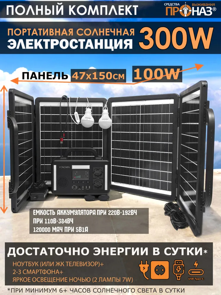 Компактная электростанция на солнечной энергии для работы приборов (220В до 300Вт) и зарядки различных портативных устройств, обеспечения освещением при ЧС, во время походов, в зоне боевых действий и других условий без электричества.