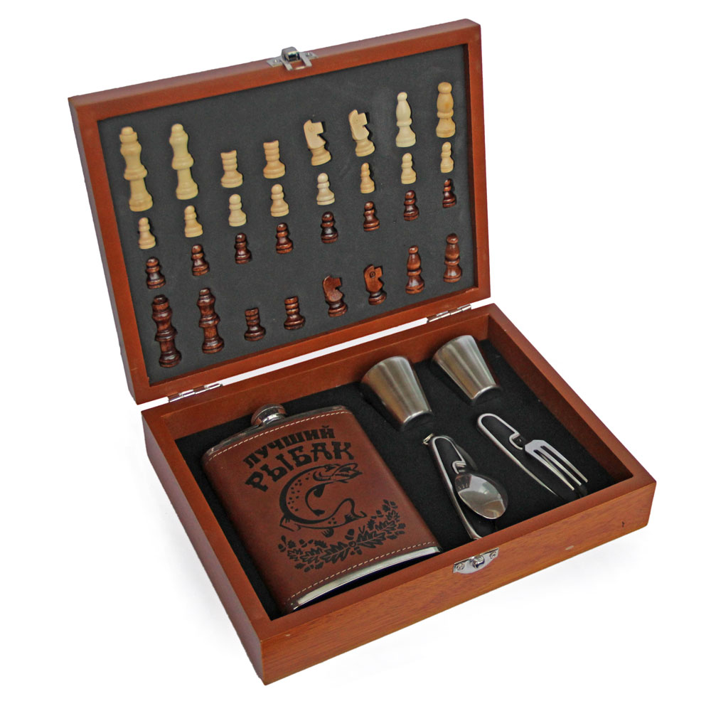 Красивый мужской подарочный набор: Шахматы, (можно играть в шашки) и фляжный набор.