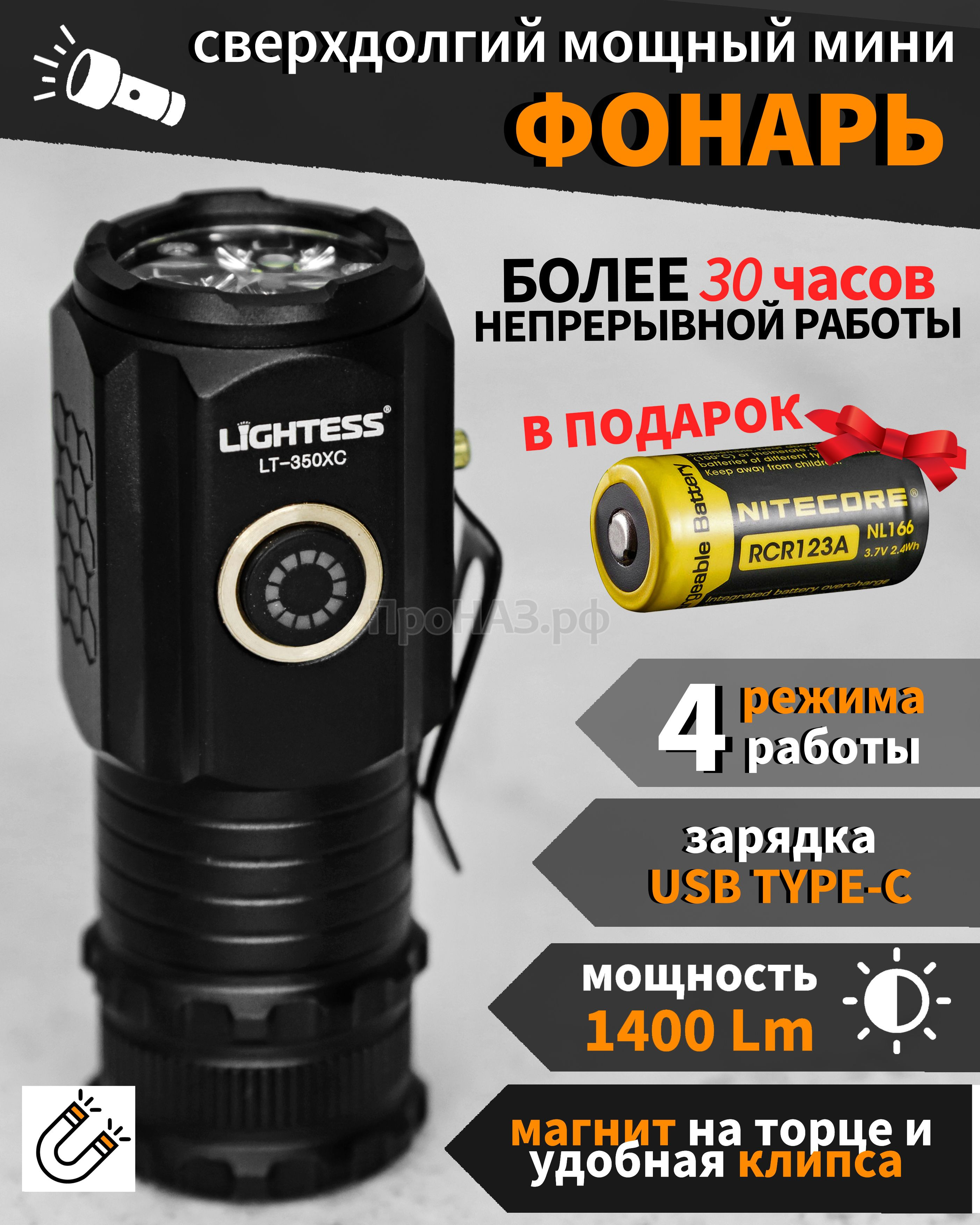Время работы при минимальной яркости 10% ~ 30 часов (с подарочным аккумулятором Nitecore);