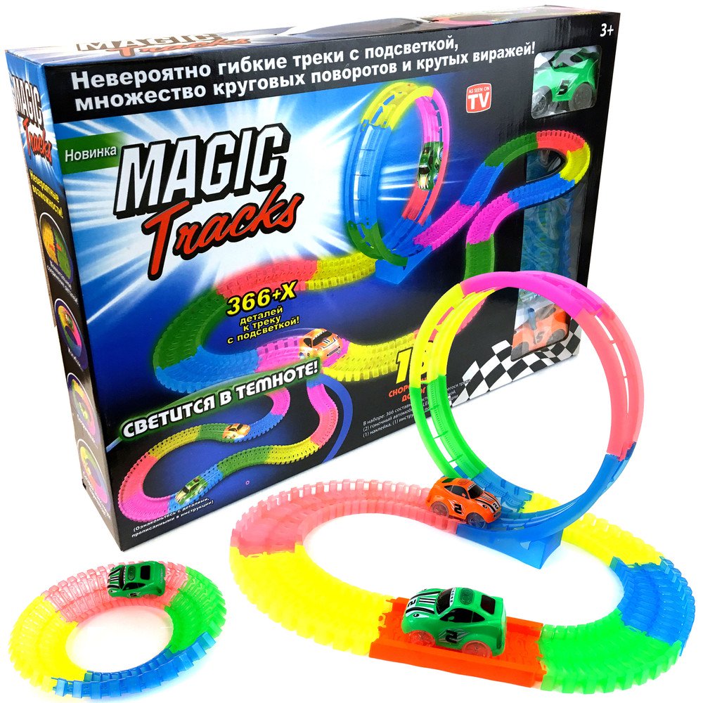 Magic Tracks - светящаяся гоночная трасса, гибкая и яркая, покорившая миллионы детских сердец. Благодаря тому, что все детали сборные, вы можете изменять гоночную трассу хоть каждый заезд. На нашем сайте можно приобрести набор Magic Tracks из 366 деталей!