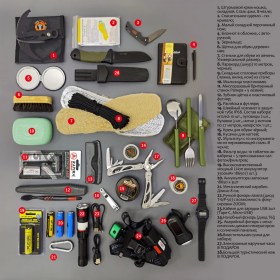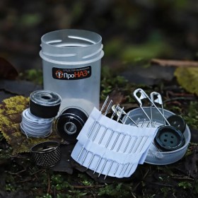 Швейный хозпакет в защитной тубе IP68. Иголка 10 шт., пуговицы 2 шт., булавки 3 шт., нитки 3 мотков по 27 метров, наперсток 1 шт.;