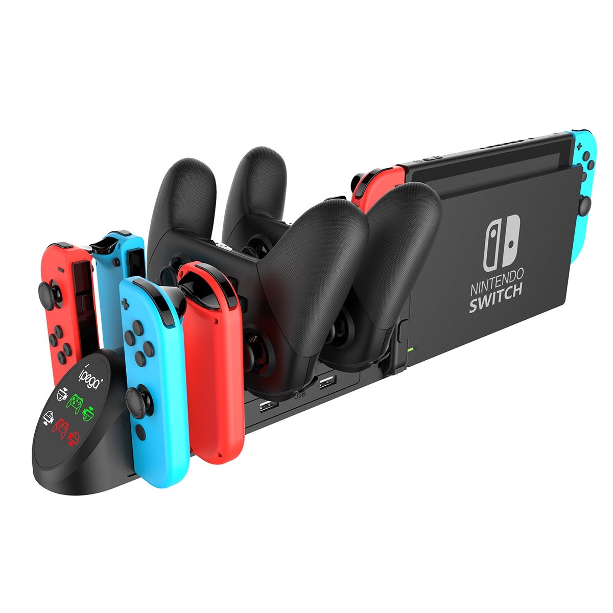Зарядная станция Charging Base 6 in 1 iPEGA PG-9187 для одновременной зарядки четырех ручек Joy Con и двух ручек Pro.
